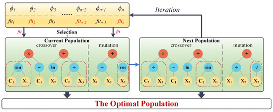 First, some individuals from the current population are selected as iterative objects based on the fitness value of the alternative function to obtain higher population quality and faster evolutionary efficiency. Second, the computational rules, by combining the two parents, keep the better characteristics of the parent individuals and thus generate diversity, contributing to finding the optimal solution faster in the search space. Finally, new computational rules are introduced during the iteration process to increase the diversity of the population and prevent the population from falling into local optimal solutions, thus improving the global search capability of the symbolic regression. The analysis procedure of symbolic regression based on the genetic algorithm is shown in Figure 3.