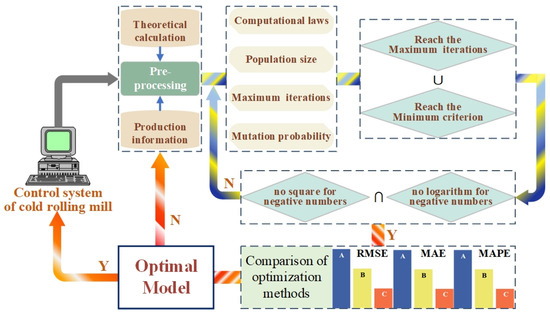 The emergence of AI (artificial intelligence)-based optimization methods provides the possibility of further clarifying the hidden relationship between various data types. It has been widely used in the optimization of rolling process parameters optimization for cold strip rolling [20,21]. Optimization of the strip gauge and shape for cold strip rolling can be achieved by the deep neural network method, improving the product quality and efficiency of production [22]. Bu et al. [23] optimized the bending roll force setting model using a multi-objective optimization method to achieve decoupled control between the bending roll and rolling force. Wang et al. [24] improved the accuracy of the coolant output for selective work roll cooling control system by a volution-gray wolf algorithm optimization support vector machine regression.