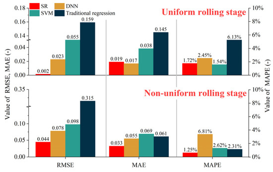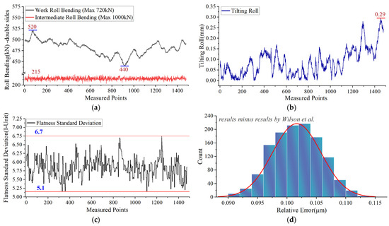 - The error frequency distribution characteristics discuss the accuracy and superiority of the research results, prediction trend analysis, RMSE, MAE, and MAPE. The influence of the work roll bending and tilting roll in the flatness actuators on the lubrication characteristics in the cold strip rolling is verified by combining the theoretical and experimental analyses. The reasons for the above-influencing characteristics are explained based on the hydrodynamic lubrication.