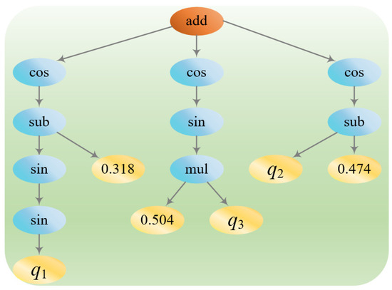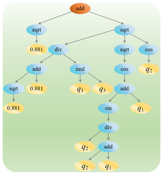 The tree structure is used to characterize the execution process of the algorithm in symbolic regression based on genetic algorithms. The tree structure naturally represents mathematical expressions and facilitates genetic operations with high flexibility and scalability [36]. In the execution process, the following occurs.