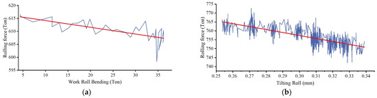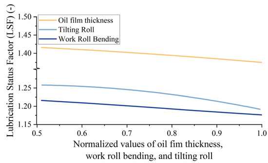 Work roll bending and tilting rolls affect the profile of the loaded roll gap, changing the distribution characteristics of the lubricant between them and, thus, the lubrication status [37,38]. Therefore, the value of work roll bending and roll tilting are taken as two important variables for analyzing the LSF and denoted as and , respectively. Both and consist of the setting value, the manually adjusted value, and the result of Equation (5) or Equation (7) corresponding to the work roll bending or tilting roll.
