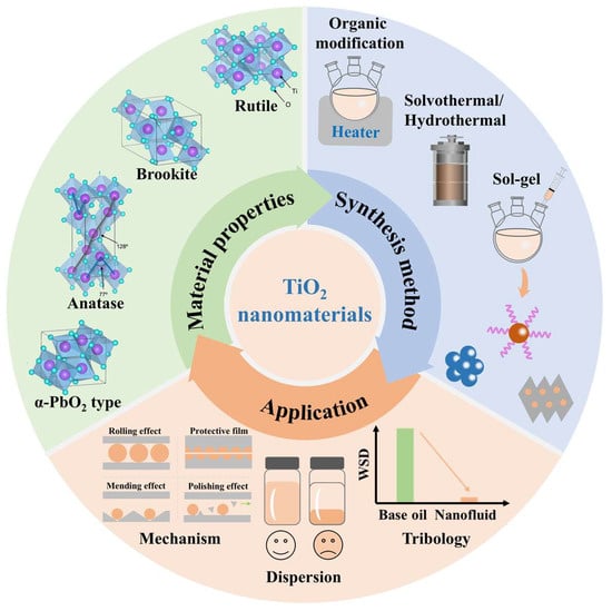 Given these challenges, our review seeks to provide a comprehensive analysis of the synthesis, stability, and performance of TiO2 nanomaterials in tribological applications. This review identifies key research gaps, particularly in understanding how synthesis methods influence the tribological properties and stability of different forms of TiO2 nanomaterials, including bare TiO2 NPs, organically modified TiO2 NPs, and TiO2 nanocomposites. The review is structured as follows: Section 2 discusses the material properties of TiO2 nanomaterials, Section 3 focuses on synthesis techniques, and Section 4 evaluates their dispersion stability, tribological properties, and mechanisms under different scenarios. This systematic approach aims to fill the identified gaps and guide the development of TiO2 nanomaterials for enhanced tribological performance, thereby providing a roadmap for future research and practical applications.