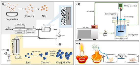 Methods and equipment for the preparation of bare TiO2 nanomaterials. (a) CVD [78]. (b) Sol–gel [72]. (c) Combustion method [80].