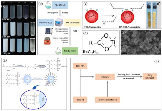 Organic modification and properties of bare TiO2 NPs. (a) Dispersion stability in toluene [84]. (b) The process of OA modification of TiO2 [30]. (c,d) Interaction patterns between OA and TiO2 [85,86]. (e) SEM images of TiO2-OA NPs [30]. (f) Comparison of nano-lubricants and base oils [39]. (g) TiO2 modified by silane coupling agent [87]. (h) The preparation of nano-lubricants employing dispersants.