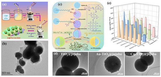 Preparation of TiO2 nanocomposites by sol–gel method. (a) Schematic diagram of the sol–gel preparation process of Au@TiO2 and (b) TEM images [112]. (c) Schematic diagram of the sol–gel preparation process of TiO2-coated jojoba oil microcapsules, (d) TEM images, and (e) anti-wear performance [110].