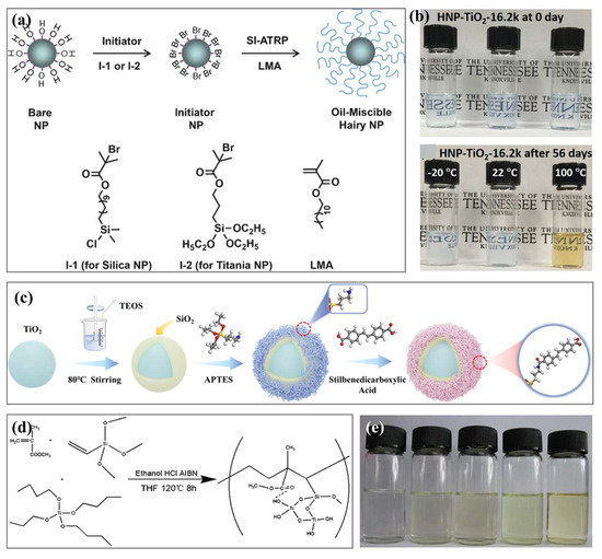 The polymer layer on the polymer/TiO2 surface not only enhances the compatibility of TiO2 with the organic phase but also improves other key properties, such as tribological properties and dispersion stability [16,113]. For example, polymer-brush-grafted TiO2 NPs were clear and transparent when dissolved in polyalphaolefin (PAO) and were stably dispersed at −20, 22, and 100 °C for 56 days (Figure 8a,b). The incorporation of 1% NPs can result in a substantial reduction in the friction coefficient (COF) and wear volume, with a decrease of approximately 40% and 90%, respectively, in comparison to the base oil. In addition to enhanced compatibility, the dispersion stability of polymer/TiO2 may also benefit from the enthalpic interactions and entropic steric repulsions of the polymer brushes [114]. Xie et al. [115] employed in situ polymerization to introduce a polycyclic aromatic compound (PAC) onto the TiO2@SiO2 surface, with the objective of enhancing the compatibility of TiO2@SiO2 nanocomposites with polypropylene (Figure 8c). Nevertheless, the synthesis of polymer brushes is a relatively complex process, and the degree of control that can be exerted over the polymerization process is limited [116]. Furthermore, the polymerization reaction necessitates the preferential modification of (γ-aminopropyl) triethoxysilane as a surface-active site, which facilitates the polymerization reaction occurring on the nanocomposite surface. This approach, while effective, results in a complex multi-step procedure and introduces undesirable factors such as centrifugation and drying, which can complicate the overall process.