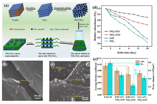 Preparation of TiO2 nanocomposites by the hydrothermal method. (a) Schematic diagram of the preparation process of TiO2/Ti3C2 [123]. SEM images of (b) GO and (c) TiO2@GO [125]. (d) Dispersion stability and (e) tribological properties of TiO2/GO nanocomposites [124].