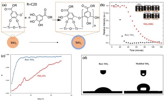 Surface modification to enhance the stability of bare TiO2. (a) Schematic representation and (b) stability evaluation of surface-modified polymers [32]. (c) Stability evaluation of surface-modified OA [30]. (d) Water contact angle of TiO2 before and after OA modification [141].