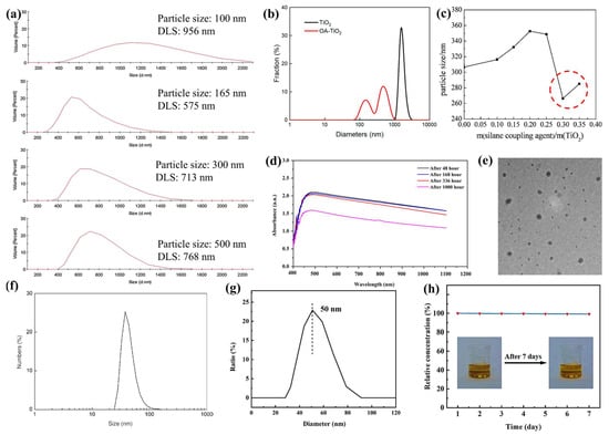 The influence of particle size on the dispersion stability. (a) Particle size distribution of bare TiO2 with different particle sizes after ultrasonic dispersion in PAO2 [40]. (b) Particle size distribution of bare TiO2 before and after OA modification [85]. (c) Particle size of TiO2 after silane coupling agent modification [141]. (d) Dispersion stability of OA-modified Al2O3/TiO2 mixtures [149]. (e) TEM image and (f) particle size distribution of monodisperse TiO2-OA prepared by sol–gel method [150]. (g) Particle size distribution and (h) dispersion stability of TiO2-SA prepared by sol–gel method [13].