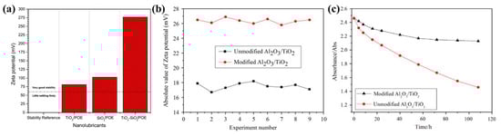 It is commonly accepted that NPs exhibit enhanced dispersion stability when their zeta potential is above 30 mV or below −30 mV [71]. The surface modification and hybridization of nanomaterials may influence the zeta potential, which, in turn, affects the dispersion stability of the NPs [141,151]. Hamisa et al. [152] dispersed TiO2 and SiO2 NPs into polyol-ester (POE) using magnetic stirring and sonication. They observed that the TiO2+SiO2/POE nano-lubricant exhibited a lower precipitate yield than TiO2/POE after 30 days. Following preparation, the TiO2+SiO2/POE zeta potential value of 276.8 mV was notably higher than that of 81.1 mV for TiO2/POE (Figure 12a). They drew the conclusion that the higher absolute value of the zeta potential indicates a stronger electrostatic repulsion between the NPs, which may be the reason for the observed decrease in precipitation. The same results were also observed in polyvinyl ether base oils [153]. Luo et al. [154] similarly found that after ultrasonically dispersing in carrier oil, the zeta potential of the modified Al2O3/TiO2 nanocomposite was higher than that of the unmodified control, which is also consistent with the data on the dispersion stability (Figure 12b,c). This suggests that by physically and chemically modifying TiO2 NPs, their zeta potential can be effectively modulated, thereby increasing inter-particle repulsion and thus enhancing their dispersion stability in base oils.