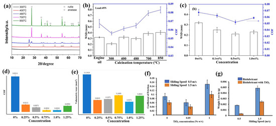 Tribological properties of bare TiO2 NPs. (a) XRD patterns of TiO2 at different calcination temperatures and effect of TiO2 calcination temperature on the (b) COF/WSD, (c) COF, and WSD for different concentrations of TiO2 [41]. (d) COF and (e) volumetric wear for different concentrations of TiO2 [143]. Effect of sliding velocity on (f) COF and (g) weight loss [162].