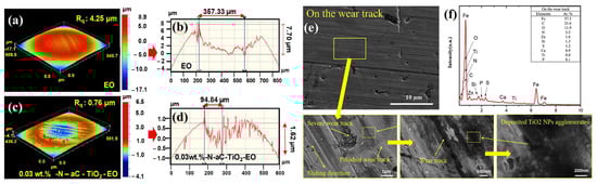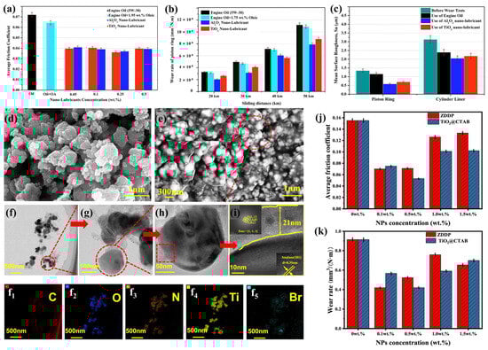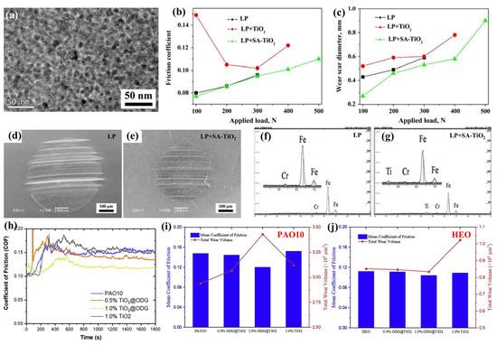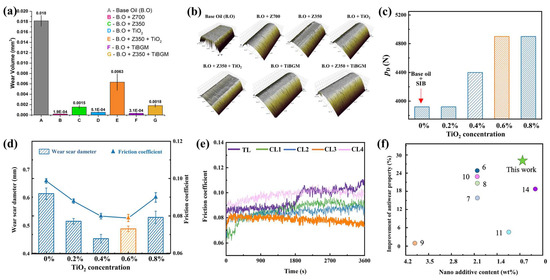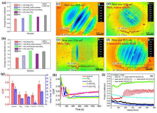 Vegetable oils are of interest due to their accessibility, environmental friendliness, and renewability, as well as their ability to effectively enhance the compatibility and tribological properties of bare nanomaterials with base oils [143,163]. Cortes et al. [143] demonstrated that the addition of bare TiO2 NPs resulted in a 93.7% and 70.1% reduction in COF and wear volume, respectively, relative to sunflower oil (Figure 13d,e). Animal oil has also been identified as a promising renewable bio-lubricant. Prathiba et al. [162] dispersed bare TiO2 NPs into modified chicken oil using ultrasound. The results demonstrated that the addition of only 0.05% TiO2 NPs improved the COF and wear volume (Figure 13f,g). These findings suggest that bare TiO2 NPs are an effective bio-lubricant additive.