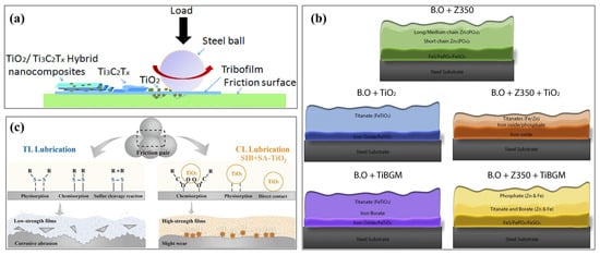 TiO2 nanomaterials have been the subject of considerable interest due to their distinctive physicochemical attributes, particularly their high-temperature stability, exceptional tribological properties, and non-toxicity and environmentally benign characteristics [20,21,22,23]. TiO2 nanomaterials can reduce friction and wear through a combination of a rolling effect, a mending effect, a polishing effect, and the formation of a protective film. Their tribological performance is comparable to that of the traditional extreme-pressure and anti-wear additive zinc dialkyl dithiophosphate (ZDDP) [24,25,26]. The tribological performance could be further enhanced by their combination with sulfur-containing additives [27]. This indicates that TiO2 nanomaterials have the potential to reduce the utilization of sulfur-containing additives, such as ZDDP, thereby mitigating environmental contamination. Furthermore, titanium is the ninth most abundant element, representing approximately 0.6% of the total mass of the Earth’s crust [28]. This provides a robust foundation for the extensive utilization of TiO2 in tribology. At present, various types of TiO2 nanomaterials, including bare TiO2 nanoparticles (NPs), organically modified TiO2 NPs, and TiO2 nanocomposites, have been employed to enhance the friction reduction, anti-wear, and extreme-pressure properties of multitude of base oils (Table 1).