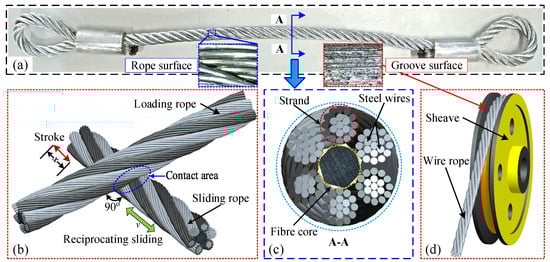 Wire rope samples with different contact forms: (a) wire rope sample; (b) rope-rope contact; (c) rope structure; (d) rope-sheave contact.