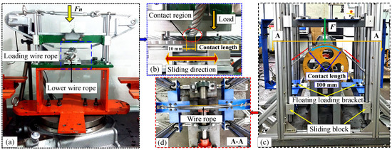 Friction and wear test rigs: (a,b) sliding wear between wire ropes; (c,d) sliding wear between rope and sheave.