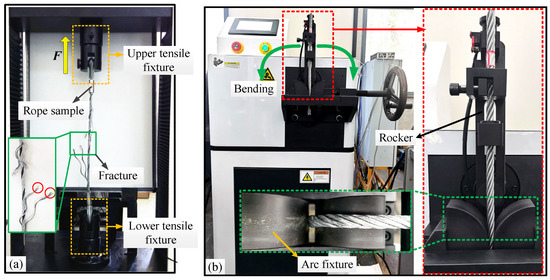 To explore the effects of these two kinds of surface wear on the tensile and bending fatigue properties, the important load forms of service wire ropes, the mechanical tests were carried out by customized mechanical performance testing devices, as shown in Figure 3. Additionally, the differently damaged rope samples were divided into two groups according to the sliding distance and contact form, which are used to carry out the breaking tensile test (see Figure 3a) and bending fatigue test (see Figure 3b), respectively. To accurately evaluate the impact of wear evolution on the mechanical properties of steel wire ropes and to clearly analyze the load variation process, the tensile speed for the breakage tensile test and the bending frequency for the bending fatigue test were standardized. The specific test parameters are outlined in Table 4. Furthermore, the force–elongation curves of different rope samples were studied during the uniform tensile test. The rope samples’ fracture evolution characteristics in the bending fatigue process were also analyzed. Moreover, through the experimental study of mechanical properties, the influence of wear evolution on the service performance degradation of the wire rope under different sliding contact conditions of the worn wire ropes under various contact conditions were revealed, respectively.