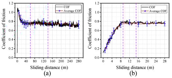 The COF curves of the wire rope under different contact pairs: (a) rope–sheave contact; (b) rope–rope contact.