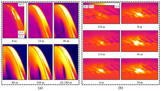 Infrared thermal images of the friction pairs under different sliding distances: (a) rope–sheave contact; (b) rope–rope contact.