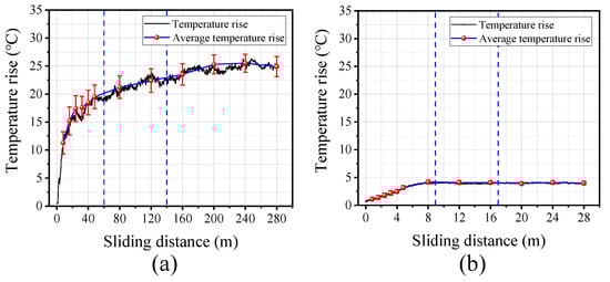 Temperature rise curves with different contact pairs: (a) rope–sheave contact; (b) rope–rope contact.