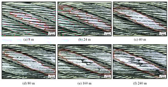 The wear scars of the wire rope subjected to rope–sheave sliding wear are presented in Figure 7. As the sliding wear distance increases, the evolution of surface wear on the wire rope is obtained. The extensive contact surface between the wire rope and the sheave, which is about 100 mm, results in wear scars appearing across several strands on the surface of the wire rope. In this paper, the wear scars on the middle strand of the sliding wear area of the wire rope are selected for comparative analysis. It can be seen that when the distance of sliding is under 40 m, wear scars on the surface of the strand are irregularly oval. Additionally, affected by the twist direction of the rope strand and the steel wire, the wear scars generated by the rope–sheave friction pair are distributed along the axis direction of the surface steel wires. Due to the light wear degree during the preliminary phase of the sliding wear experiment, the wear depth at the wear scar is small, and the distance between the wires is visible, leading to a jagged appearance of the wear scar on the surface of the wire rope. This process corresponds to the rapid change stage of the COF and the temperature rise. This is because the wear area increases while the surface becomes smoother and more complete. Furthermore, as the sliding distance extends from 80 m to 240 m, the contour of the wear scar becomes more regular, and the wear is more severe. Large amounts of wear debris and surface extrusion deformation are generated during the wear process, and the wear depth increases, resulting in the gap between the wires being filled, the surface of the wear scars being more complete, and the contour being smoother (see Figure 7d). However, as the wear distance increases, the surface steel wire has serious material loss, and the bearing capacity degrades greatly. Wang et al. [31] studied similar issues. They found that the center position of the contact area between the steel wire rope and the rope groove was the most severely damaged, and the bending stress and friction coupling effect in this area were the most obvious. In addition, as the number of wear cycles increased, the degree of wear became more and more severe. This is consistent with the wear evolution trend of the steel wire rope under the working conditions studied in this paper. Therefore, the wire, which exhibits significant damage in the central region of the wear scar, experiences failure as a result of frictional forces and dynamic contact stresses.