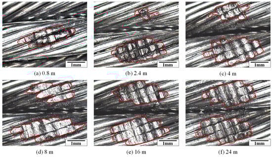 Under the condition of the rope–rope sliding friction test, Figure 8 illustrates how wear scars on the surface of the loading rope develop as the sliding distance increases. The contour characteristics and distribution of the wear scar differ from the experimental results under the condition of rope–sheave contact. Because the length of the sliding contact area is only about 10 mm, the surface wear of the wire rope is very concentrated. Although the profile of the wear scar is still nearly elliptical on the surface of the rope strand, the overall size is significantly smaller. When the sliding distance is short, the wear area is small and concentrated on the rope strand (see Figure 8a). Only two steel wires are damaged. As the sliding distance increases, the wear area gradually distributes across the surfaces of both strands (see Figure 8b,c). This is because the surface structure of the wire rope is complex. The unevenness of the friction pair’s surface is a result of the space between the wires and strands. Additionally, the increasing wear depth during the wear process reduces the influence of irregular surface pairs and increases the contact area of the rope–rope friction pair. As the sliding distance increases, the wear scars become progressively and uniformly spread across the surfaces of both strands due to relative sliding action, as illustrated in Figure 8d–f. Furthermore, due to the multi-wire spiral structure of the friction pair, multiple grooves caused by the sliding wear of the steel wires appear on the wear surface under the condition of the rope–rope contact pair. Moreover, there is also a big difference in the wear degree in the wear scar area. The wear depth in the middle of the wear area is the largest. Thus, the damage is the most serious in the middle position of the ellipse, and the wear observed at both ends is comparatively slight. The primary reason for this is the circular arc configuration of the wire rope friction pair. Compared with the wear evolution between the internal wires of the steel wire rope, the external wear of the steel wire rope is more complex. The damage profile caused by the inter-wire wear is also an irregular ellipse, mainly due to the accumulation of wear debris and plastic flow [12]. Therefore, through the surface damage features of the transport wire ropes, the contact form that causes its damage can be distinguished, and targeted protection and maintenance can be carried out during the use and maintenance process.