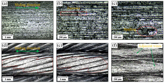 The wear appearances of the counter bodies under different friction pairs are presented in Figure 9. Because the surface characteristics of the counter pair of the wire rope change relatively little in the wear evolution, the typical wear morphology of the moving friction pair was analyzed. In the context of the rope–sheave friction experiment, the wear appearances of the rope groove are shown in Figure 9a–c. The furrows along the sliding direction are distributed on the surface of the rope groove. Additionally, the surface is relatively rough, and obvious plastic deformation and spalling can be seen. This indicates that the wear mechanism of the rope groove is mainly abrasive wear and adhesive wear. Because the surface structure of the loading wire rope is irregular, the surface material of the rope groove easily produces extrusion deformation and adhesion under the influence of friction heat. Moreover, under the condition of the rope–rope friction pair, the wear scars of the sliding wire rope are shown in Figure 9d–f. During the wear test, the wear scars of the sliding wire rope change little and the surface is smooth. The wear morphology is similar to that of the loading wire rope. Due to the obvious gap between adjacent steel wires, different grooves appear in the wear region of the loading rope samples.