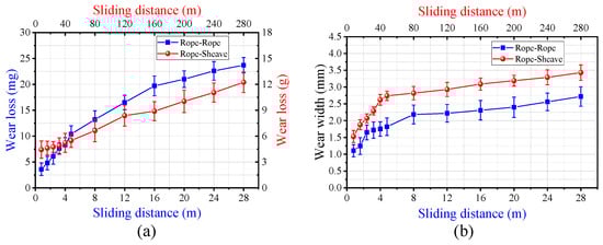 To quantitatively investigate the variation in the wear extent of the wire rope under various contact forms, this study calculates both the wear loss and the width of the wear scar, as depicted in Figure 10. As the sliding distance increases from 8 m to 280 m, the wear loss increases from approximately 4.5 g to 12.2 g, and the wear width increases from approximately 1.5 mm to 3.4 mm under the condition of a rope–sheave contact pair. Moreover, when the contact form changes to a rope–rope friction pair, the wear loss increases from approximately 3.8 mg to 23.7 mg, and as the sliding distance varies from 0.8 m to 28 m, the wear width expands from roughly 1.1 mm to 2.7 mm. The degree of surface wear under the condition of rope–sheave contact is greater than that under the condition of rope–rope contact. In particular, the difference between the two is one order of magnitude for the experimental results of wear loss (see Figure 10a). This occurs due to the surface wear of the wire rope being a cumulative and progressive evolution, and the contact area of the rope–sheave friction pair is larger. The wire rope and the sheave groove will produce large wear debris during the experiment. The wear width analyzed in this paper refers to the maximum wear width observed on a single-strand surface (see Figure 7). However, there is a big difference in the overall wear degree of the wire rope under the two contact states, and the difference in wear width is not as obvious as the result of wear loss (see Figure 10b). Additionally, the wear characteristic parameters showed a rapid growth trend at the beginning of the experiment, and then the growth rate slowed down. This is closely related to the variation in the above-mentioned wear scar distribution. Furthermore, influenced by the intricate circular arc structure of wire ropes, the increase in the wear depth will not lead to the rapid increase in the wear scar area in the later stage of the experiment, but the wear loss still shows a significant growth trend. Therefore, the degree of wear of the rope–sheave contact pair under similar working conditions is more serious. The change in wear loss can better reflect the wear evolution characteristics of the transmission wire rope.