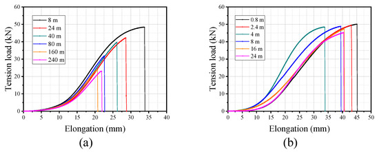 The force–elongation curves of the damaged wire rope caused by different contact forms: (a) rope–sheave contact, (b) rope–rope contact.