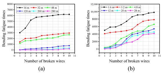 The bending fatigue test outcomes of the wire rope with varying damages are presented in Figure 15. In the bending fatigue test, as the number of bending cycles increases, the number of broken wires in the steel wire rope gradually increases. The bending fatigue testing machine records the number of bending cycles for each test and simultaneously observes and records the broken wire situation of the steel wire rope, thereby establishing the corresponding relationship between the number of bending cycles and the number of broken wires. Additionally, when broken wires reach 10, the steel wire rope is considered scrapped. Therefore, the termination criterion for a single fatigue test is the appearance of 10 broken wires in the steel wire rope. By examining the correlation between the number of broken wires and the bending fatigue cycles, it can be found that there are great differences in bending fatigue performance at different stages of the wear evolution. As shown in Figure 15a, under the condition of the rope–sheave friction pair, the first four broken wires of the wire rope sample often require more bending fatigue times when the surface wear is mild. It is about 3000 to 5700 times. As the number of broken wires increases from 5 to 10, the change in bending fatigue times is relatively small. The bending times concentrate around 6000. This is because the number of steel wires with severe damage inside the wire rope is small, and the steel wires with relatively severe surface wear are first broken during the test. The fracture occurs almost simultaneously for the steel wires with uniform and mild wear, and the number of bending fatigue times required to achieve a fracture is also more. Moreover, with the increase in sliding distance, the number of severely worn steel wires becomes higher, and its bending fatigue resistance decreases. Less bending fatigue times will lead to the fracture of the steel wire. Especially when the sliding distance exceeds 120 m, the number of broken wires in the rope samples reaches 10 after approximately 500 times of experiencing bending fatigue. However, the bending fatigue test results of rope samples with local wear caused by rope–sheave friction pairs are quite different, as shown in Figure 15b. As the number of broken wires increases, the bending fatigue cycles of the rope samples initially rise rapidly and subsequently stabilize gradually. This is because the damage degree of the worn steel wires on the rope surface is quite different under this condition, but the overall damage is not severe, and the number of worn steel wires is small. In bending fatigue, the severely worn steel wire breaks first. With the decrease in the wear degree of the steel wire, the number of bending fatigues increases gradually. Therefore, the most important impact of wear on the bending fatigue performance of transmission wire ropes is the steel wires with more severe damage. Furthermore, the larger wear area on the rope surface will greatly reduce its bending fatigue resistance.