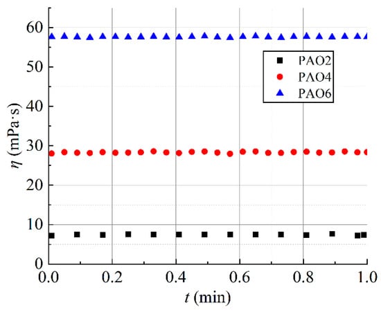 Figure 1 presents the thixotropic test results of the three samples. During the stable shear process, the viscosities of the PAO samples remained essentially constant over time, i.e., the viscosity curves resembled a nearly horizontal line. The findings indicate that these PAOs do not exhibit shear thinning and they do not display the thixotropic behavior typically associated with non-Newtonian fluids.