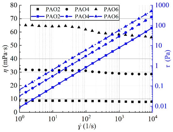 Figure 2 displays the results of the shear strain rate tests for the samples. The graph reveals that the viscosity η remained essentially constant for all three samples throughout the shear process, and the shear stress τ exhibited a nearly linear change (using logarithmic coordinates for both axes). When the shear strain rate increased, the viscosity of the very lower-viscosity PAO2 and PAO4 slightly decreased (by approximately 9% and 12% from 100 s−1 to 104 s−1, respectively), whereas the viscosity of the higher-viscosity PAO6 had a more significant decrease (approximately 15%), which indicates a clear shear thinning effect. This decrease in viscosity might have occurred because the longer, less ordered molecular chains in PAO6 became more aligned and reduced the intermolecular interactions with increasing shear []. Therefore, when high-viscosity PAO such as PAO6 is used, it is essential to consider the decrease in viscosity and reduced lubricating film capacity at high shear rates. For the very low-viscosity PAOs such as PAO2 and PAO4, the viscosity decrease caused by high shear is negligible (approximately 10%). Since PAO molecules have weak polarity, it is difficult for PAOs to dissolve additives or adhere to friction interfaces, so they are often used in multi-component synthetic lubricants where the actual impact on the lubrication analysis and application can be disregarded []. Zhang et al. [] tested the viscosity changes in PAO2-PAO6 at shear rates below 1000 s−1 and found no significant variations, which suggests that these PAOs can be treated as Newtonian fluids. Bair et al. [] observed that PAO4 exhibited noticeable shear thinning only at approximately 104 kPa of shear stress. High-viscosity PAOs such as PAO100 or their mixtures tend to show more pronounced shear thinning under similar stress conditions. In this experiment, the maximum shear stress for PAO6 was only 510 Pa, which is in the low-shear-stress regime and has minimal impact on the lubrication.