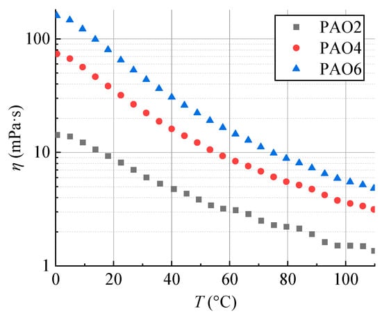 Figure 3 shows the visco-thermal behaviors of the PAOs in the temperature range of 0–110 °C. The graph reveals that similar to most lubricants, low-viscosity PAOs exhibit a decrease in viscosity when the temperature increases. At high temperatures, their viscosities converged and approached the kinematic viscosities (ν, which is the ratio of the dynamic viscosity η to the density ρ at that temperature). This trend is consistent with the data in Table 1, which serve as a basis for their viscosity grade assignments. In the 0–60 °C range, there was a noticeable difference in performance among PAOs of different grades, where PAO6 had the most significant temperature sensitivity, and its viscosity substantially decreased from its initial value. This result indicates that lower-viscosity PAOs, such as PAO2, have superior low-temperature performance, display better cold flow, and facilitate better heat dissipation at the frictional interface.