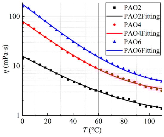 where η is the dynamic viscosity in units of Pa·s, and T is the temperature in degrees Celsius. A, n, and ηc are constants to be determined. This article refers to this equation and uses Levenberg–Marquardt algorithm, one of the most effective and popular algorithms based on nonlinear least square methods, to fit the experimental data. The fitting results converge and yield the visco-thermal relationship curve and equation for the low-viscosity PAOs, as shown in Figure 4 and Table 2, respectively. The fitting results indicate that in the temperature range of 0–110 °C, the correlation coefficients (Adj. R-Square) are close to 1, and the fitted curve closely matches the experimental data. Thus, Equation (1) is suitable for fitting the visco-thermal curve of PAOs and can be used to predict the viscosity of PAOs at a specific temperature with reasonable accuracy under certain conditions.