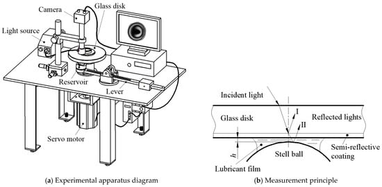 A ball-on-disk tribometer, as depicted in Figure 5, was used to measure the lubricating film thickness of the PAOs under different speeds and loads based on the principles of optical interference and relative light intensity. As illustrated in Figure 5a, the experimental apparatus primarily consists of a glass disk driven by a servo motor, a lever that supports a reservoir (containing a steel ball), and a camera along with a coaxial light source positioned above the contact point. Figure 5b illustrates the measurement principle wherein the incident light produces two coherent light beams upon reflection from the two contacting surfaces of the friction pair, designated as reflected lights I and II. The camera captured the interference fringes, whose brightness, color, and order indicate the film thickness. Table 3 and Table 4 show the tribological properties of the friction pair and lubricant characteristics, respectively, for the experimental setup.