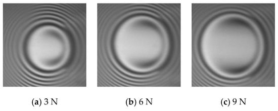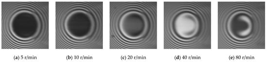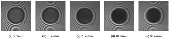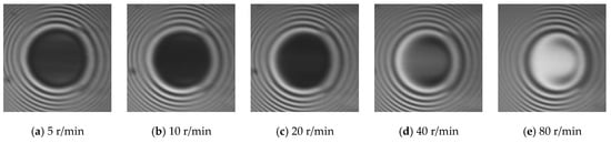 As shown in Figure 6, when the glass plate rotated at a speed of 20 r/min or above, the interference fringes exhibited a distinct horseshoe shape. This unique characteristic of elastohydrodynamic lubrication occurred because of the elastic deformation of the friction pair materials and the need to maintain flow balance at the inlet and outlet. At the exit of the friction pair, a constriction of the lubricant was visible, which resulted in a thinner lubrication film (with the lubricant entrance on the left and the exit on the right). The thinnest film thickness was observed in the earlobe regions on both sides. At lower speeds (5 r/min and 10 r/min), the lubrication film in the central area was more uniform, which made it more difficult to detect the necking phenomenon. According to the classical elastohydrodynamic lubrication theory, when the rotational speed of a friction pair is low, the lubrication film is relatively thin, which potentially indicates a transition from elastohydrodynamic to boundary lubrication conditions.