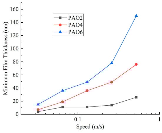 Minimum film thickness of PAOs versus speed (Load 3 N).