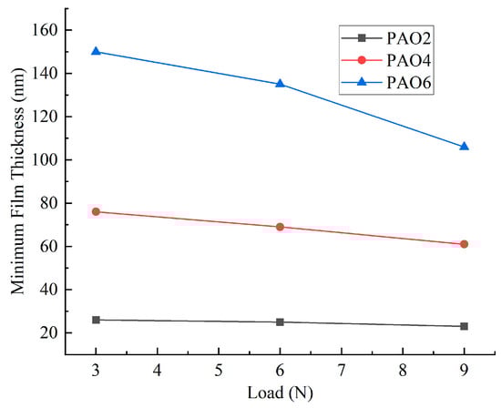 Minimum film thickness of PAOs versus load (Speed 80 r/min).