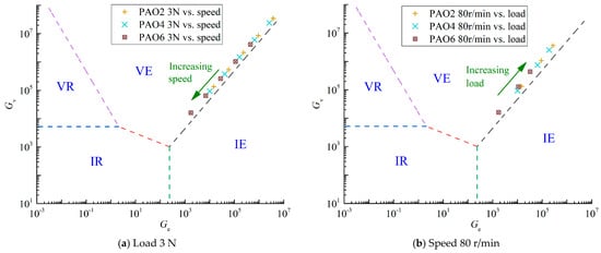 Figure 12 shows the lubrication regimes chart (Greenwood chart) of the PAOs studied in this paper [,,]. Figure 12a shows the distribution of lubrication regimes with speed changes under a constant load (3 N). It can be seen from Figure 12a that the lubrication regimes of several PAOs are all in the VE region, that is, the elastohydrodynamic lubrication zone, but they are closer to the boundary between the VE region and the IE region. Therefore, at this time, using the elastohydrodynamic lubrication calculation method, there may be a large deviation (30%) between the calculated results and the actual film thickness []. It should be noted that with the increase in speed in the figure, the lubrication regime is moving towards the IR region (Ge decrease), and the PAO with higher viscosity is closer to the IR region than the PAO with lower viscosity. Figure 12b shows the lubrication regimes of each PAO changing with load at a constant speed (80 r/min). Similarly to Figure 12a, the PAO with higher viscosity is closer to the IR region than the PAO with lower viscosity, and the lubrication regimes of several PAOs are all in the VE region and close to the boundary between VE region and IE region. However, unlike Figure 12a, with the increase in load, the lubrication regime gradually moves away from the IR region (Ge increase). When moving away from the IR region, the deviation of using the elastohydrodynamic lubrication calculation method may be relatively small.
