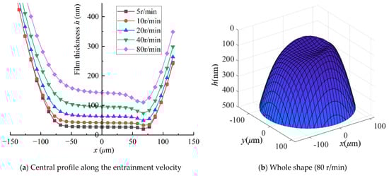 By applying dimensional normalization and differential discretization to Equations (4)–(8), iterative calculations can be performed to obtain a numerical solution for the lubrication film thickness under specific operating conditions. Figure 13 shows the lubrication film profile of PAO4 under the same load but with different glass disk rotational speeds.
