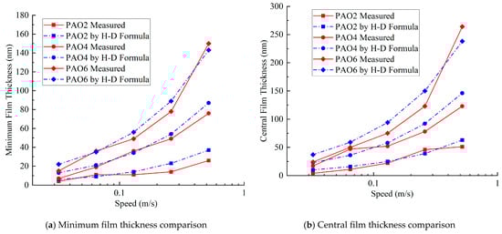 As shown in Figure 14, the experimental results for the minimum and central film thicknesses generally follow the same trend as Hamrock–Dowson film thickness formula, where the thickness monotonically increases with increasing speed. The results for the same PAO are not significantly different from the calculated values, which indicates that Hamrock–Dowson formula remains applicable for low-viscosity PAOs and low-speed conditions and can predict the lubrication film thickness generally. In Figure 14a,b, the minimum film thickness calculated using Hamrock–Dowson formula is closer to the experimental results than the central thickness. However, in more demanding scenarios, the Hamrock–Dowson formula slightly overestimates the actual thickness at higher speeds, and the difference between calculated and experimental results for PAO6 with a higher viscosity may be more significant than those for PAO2 and PAO4. The reason is as follows: as the rheological performance tests in Figure 2 show, compared to PAO2 and PAO4, PAO6 exhibits more pronounced shear thinning behavior at higher shear rates, which leads to a larger deviation when it is treated as a Newtonian fluid in the numerical calculations. Zolper’s previous investigations also proved that, low-molecular-mass PAOs, including PAO4 exhibited Newtonian film-forming ability at the specific entrainment speeds [].