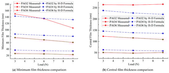 In Figure 15, the experimental results for various loads (with a glass plate rotation speed of 80 r/min) are compared to the calculations using Hamrock–Dowson film thickness formula. When the load changes from 3 N to 6 N and 9 N, there is a noticeable deviation between the minimum or central film thicknesses of the very low-viscosity PAO2 and PAO4 and the calculated values, but this deviation remains relatively consistent. The calculated thickness consistently exceeds the experimental values, which is consistent with the analysis in Figure 14. Hence, the formula tends to overestimate the actual thickness at higher speeds. However, for PAO6 with a higher initial viscosity, the minimum film thickness calculated via the formula may be either smaller or larger than the experimental value; unlike the situations of PAO2 and PAO4, the calculated central thickness of PAO6 is consistently smaller than the experimental values. Estimating the actual film thickness for high-viscosity PAO6 using this formula may prove challenging.