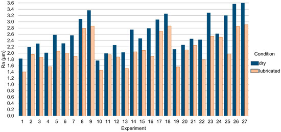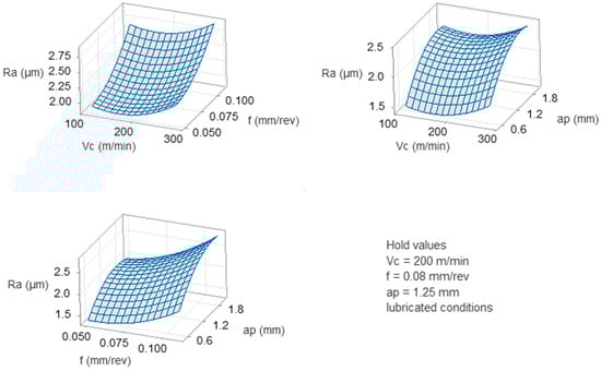- The use of coolant acted decreasingly on the generated surface roughness. The average decrease was calculated to be equal to 20.7%, 21.6%, and 26.1% for the three different cutting speed levels, respectively.