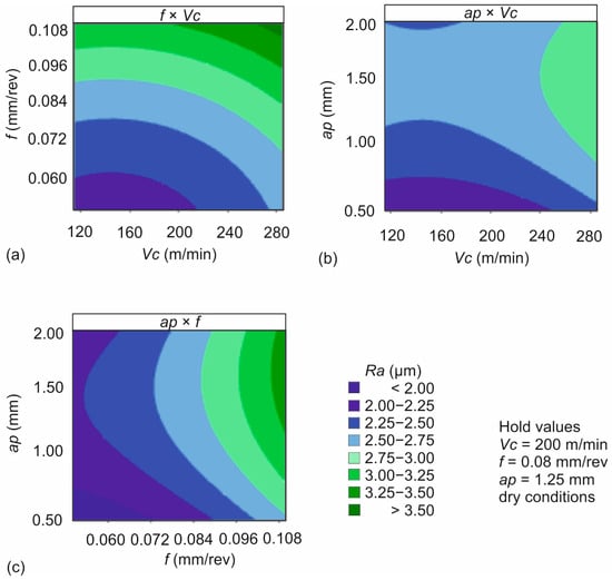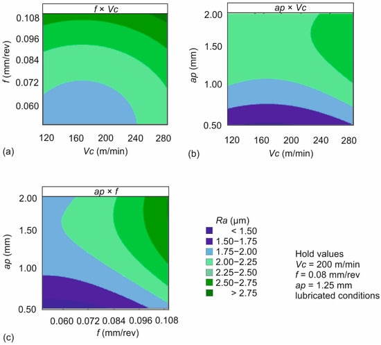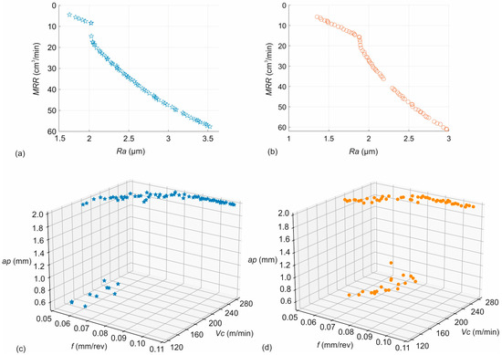 - The Pareto fronts of optimal solutions identified combinations that contribute towards minimization of Ra and maximization of MRR. The majority of the solutions highlighted cutting speed between 170 m/min and 280 m/min, feed ranging from 0.06 mm/rev to 0.10 mm/rev, and depth of cut close to either 0.5 mm or 2.0 mm as the optimal combinations.