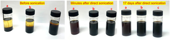 Mixed samples used in this work (pyro-oil/motor oil—wt./wt.%): (a) 10/90, (b) 30/70, and (c) 50/50, showing the effect of sonication and settling for seventeen days.