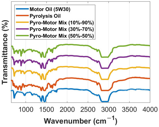 The FTIR signals of the examined specimens are recorded and shown in Figure 3. The 10–90% mixture showed a clear similarity to that of the virgin motor oil, indicating almost no chemical print impact when a minimal addition of the ELT pyro-oil is applied (e.g., 10 wt.%). Other similarities in the obtained spectrums were noted for the other examined specimens. The displayed and studied spectra result from the vibration of functional groups, which are presented as a function of wavenumbers. In theory, a nearby 3000 cm−1 frequency suggests an aliphatic alkane (C-H stretching) group [27]; this was fairly evident in the examined oil samples. A detected peak at 2726 cm−1 was quite prominent in the case presented at hand (Figure 3).