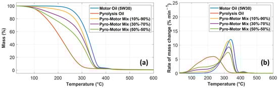 Comparison of (a) mass loss profile and (b) differential mass loss profile against temperature for motor oil, pyro-oil, 10–90% oil mixture, 30–70% oil mixture, and 50–50% oil mixture.