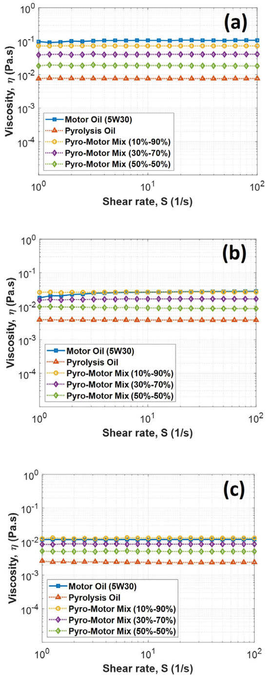 Variation in viscosity with shear rate for motor oil, pyro-oil, and their mixtures under examined temperatures of (a) 25 °C, (b) 50 °C, and (c) 75 °C.