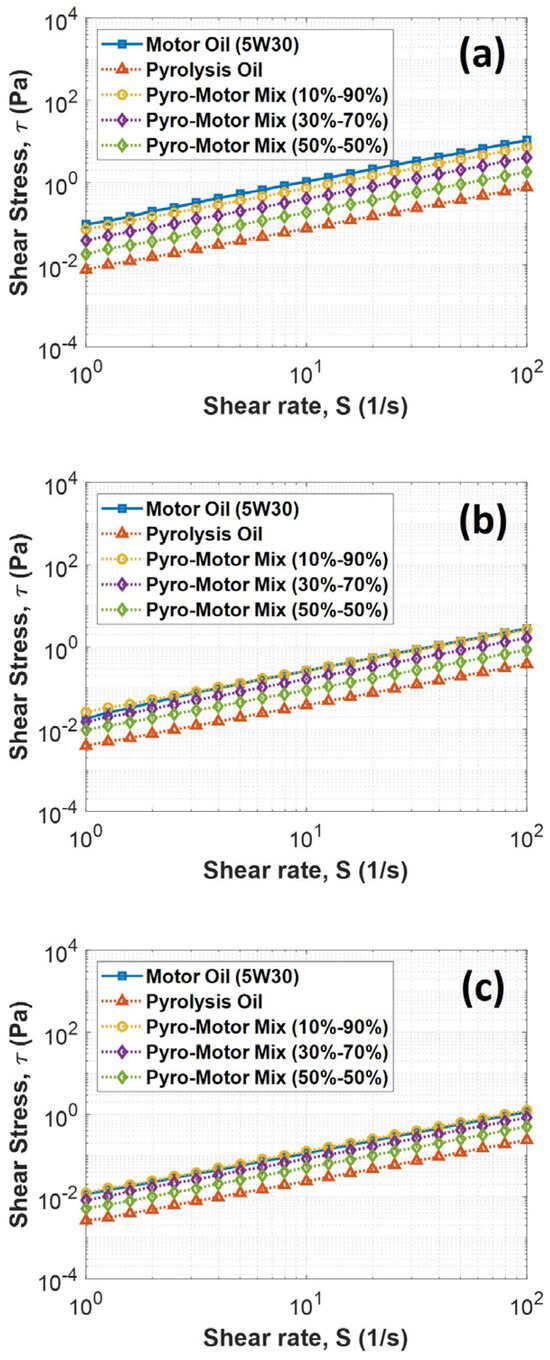 Additional rheological analyses were performed to study the change in shear stress with shear rate under various temperatures for all samples. The obtained results indicated that shear stress is linearly proportional to shear rate for all oil samples and under all examined temperatures, as shown in Figure 6. Also, it was found that the motor oil and the 10–90% oil mixture had similar behavior at all examined temperatures and shearing rates, while the pyro-oil exhibited the lowest shear stress relative to other oil samples. Additionally, the 30–70% and 50–50% oil mixture results clearly indicate that adding a high percentage of pyro-oil to the motor oil will lower its viscosity and shear stress.
