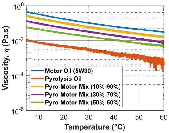 An investigation of the change in viscosity with temperature at a constant shear rate was accomplished for all oil samples (Figure 7). It is clear that the pyro-oil’s viscosity was less than the motor oil and other oil mixture samples under all examined temperatures. Furthermore, as the temperature becomes closer to 60 °C, the viscosity measurements of pyro-oil start to fluctuate, which could be explained by the fact that the onset temperature of pyro-oil is 61 °C, as discussed earlier. Compared to other oil mixtures, the 10–90% oil mixture exhibited a closer viscosity behavior to motor oil with a 35% maximum difference at all temperatures.