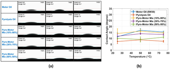 (a) Photos of the oil droplet depicting the CA at multiple temperatures for all samples. (b) Comparison of CA values against temperature for motor oil, pyro-oil, 10–90% oil mixture, 30–70% oil mixture, and 50–50% oil mixture.